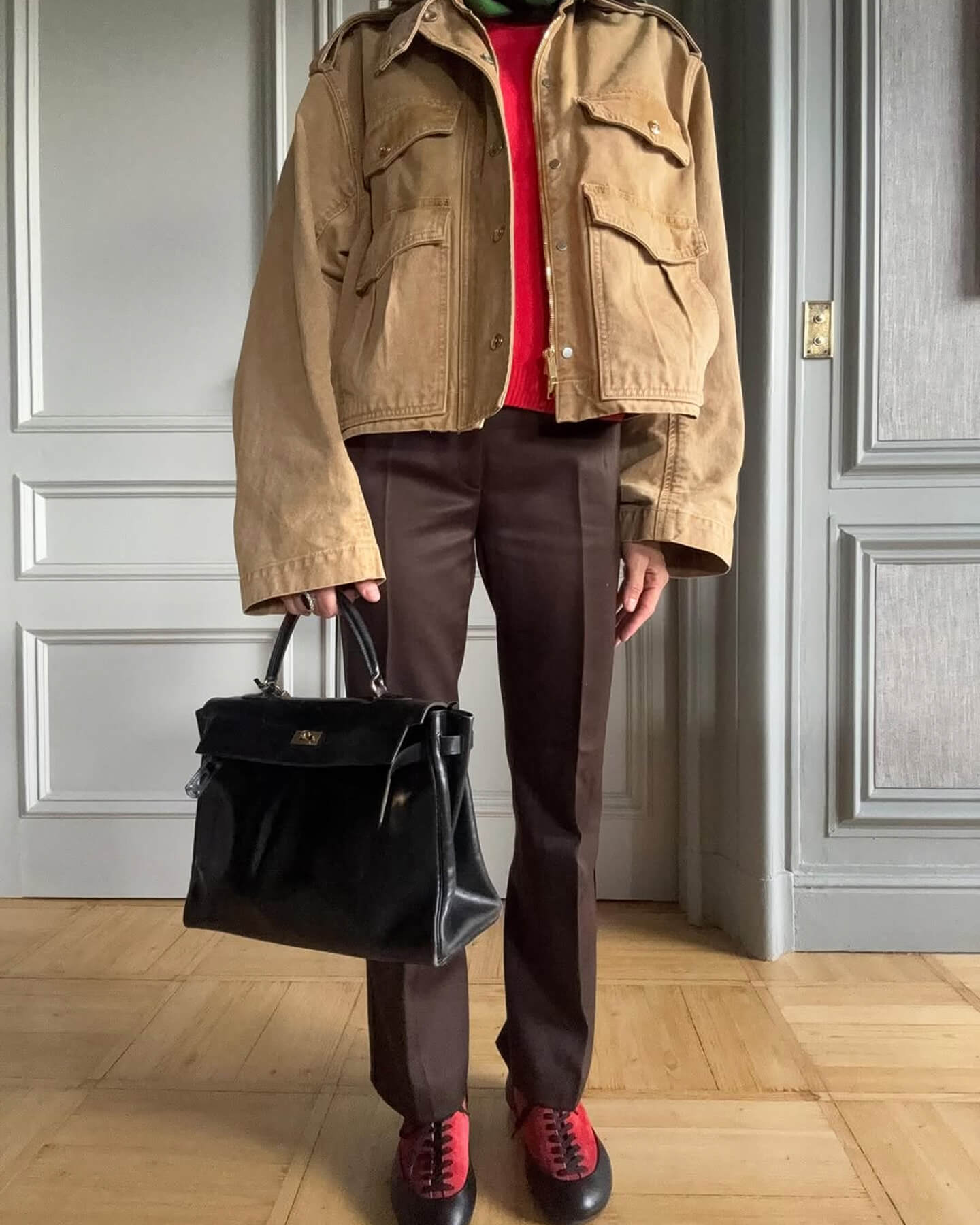 Настаиваем, что стиль modern workwear заслуживает такого же внимания, какое достается modern preppy — современному прочтению эстетики Лиги плюща. В «рабочем» гардеробе правят бал вощеные ветровки, джемперы с мужского плеча и удобная обувь — но надевать парку бойфренда с джинсами больше не обязательно: контраст нарочито небрежных предметов с классическими смотрится эффектнее. Яркий пример — харрингтон с необработанным краем поверх плиссированной миди.