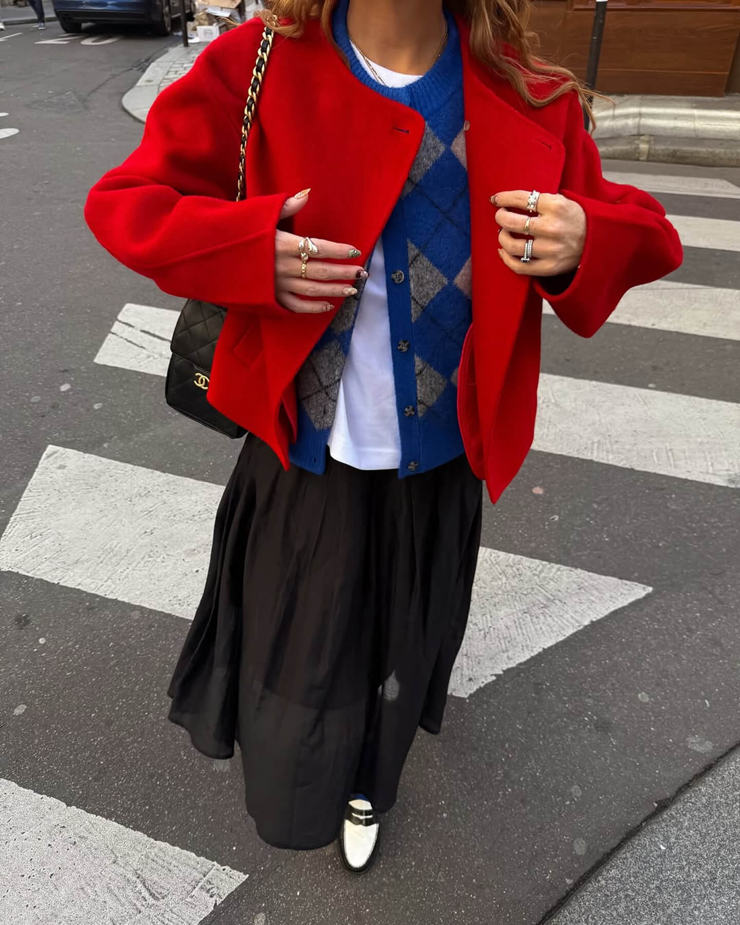 От комбо klein blue с насыщенным красным веет праздником — берите на карандаш, если ищете на предновогодние корпоративы что-то кроме пайеток. Нарядный верх дополняйте универсальной базой, но пусть в ней тоже читается страсть к геометрическим фигурам: плиссировка юбки и треугольные складки лоферов дополнят ромбический узор трикотажа.