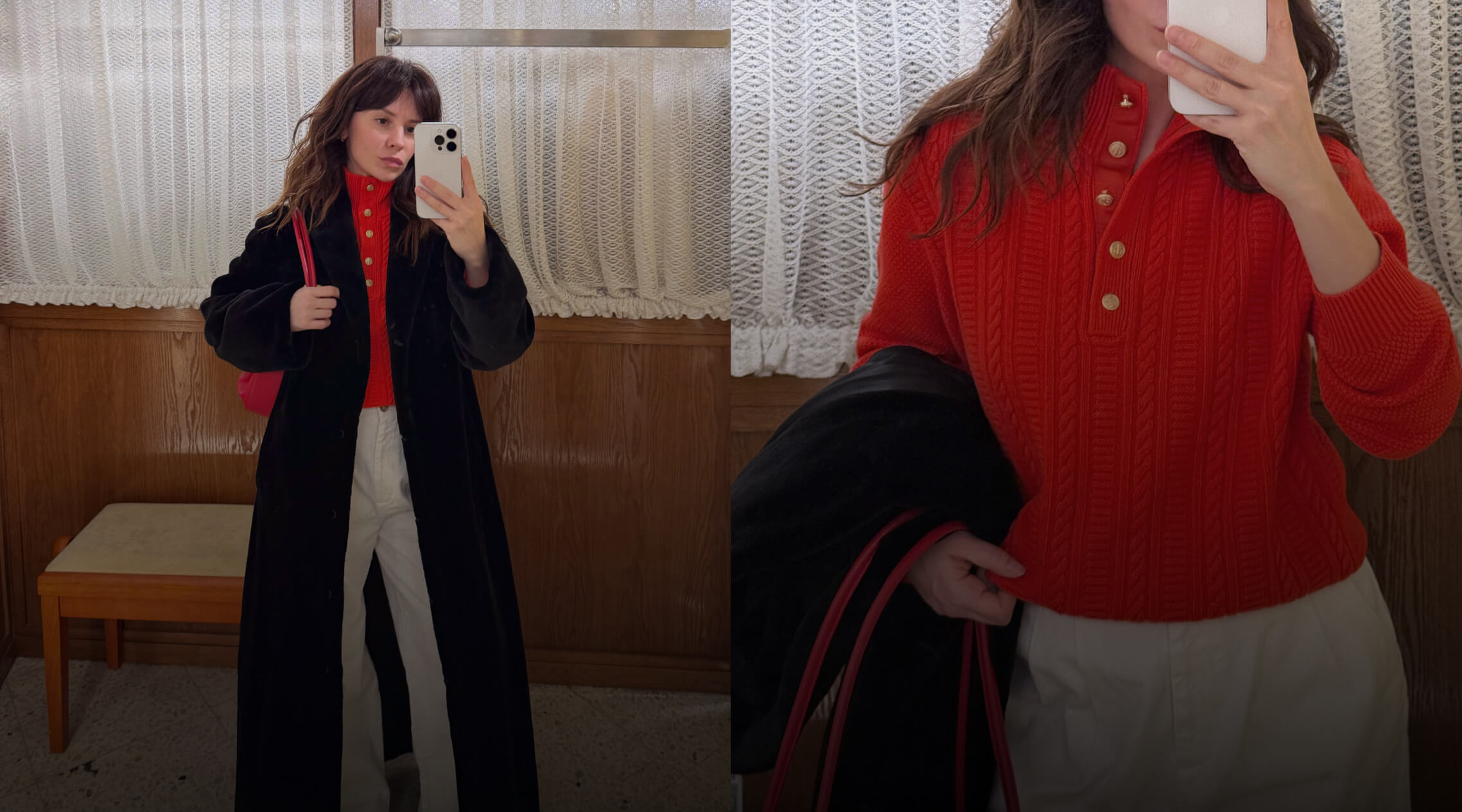 Сочетание алого с белым даже кэжуал делает торжественным — в таком виде можно отправиться завтракать первого января в пустой город. Сверху накидывайте шубу: образ получится особенно кинематографичным.