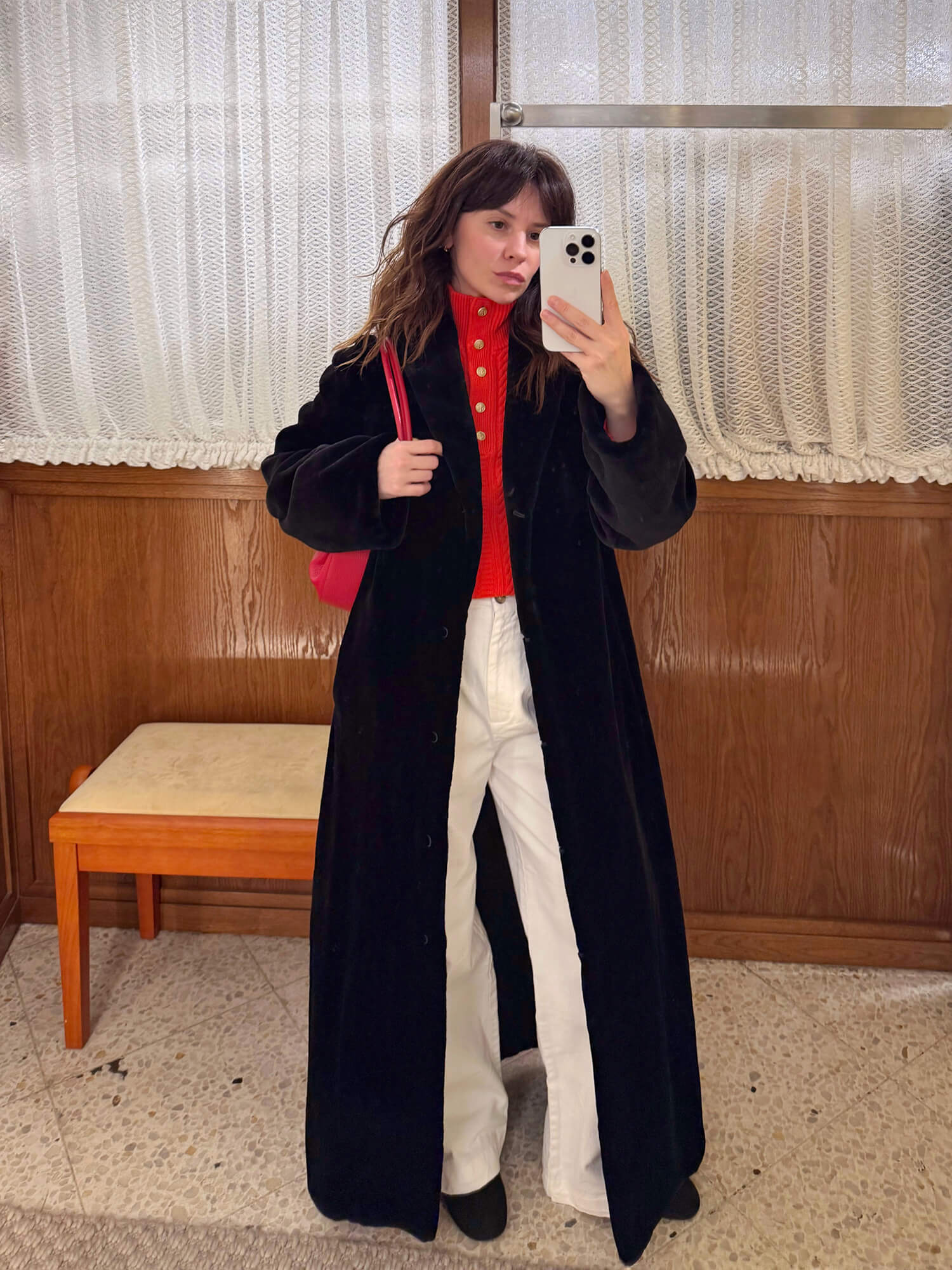 Свитер A.P.C., джинсы LOULOU DE SAISON, шуба Sencellerie (ищите в бутике), сумка YUZEFI, лоферы MIISTA.