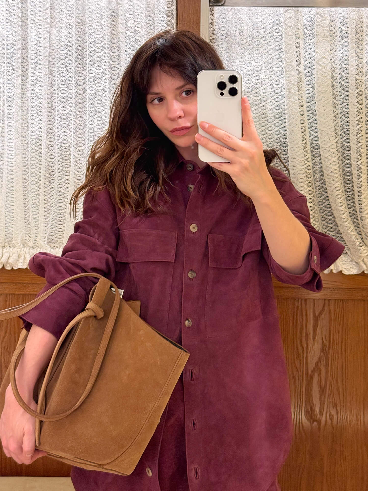 Рубашка, брюки и пальто TELA, черная сумка и песочная сумка YUZEFI, лоферы MIISTA.