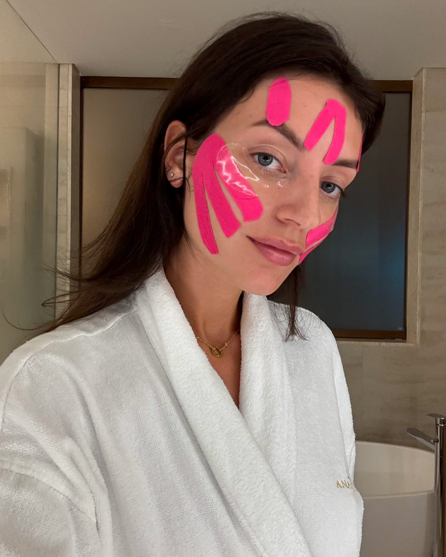 Если говорить про бьюти, мне важна максимально увлажненная, наполненная кожа — эффект glazed skin. Для этого важно и то, что происходит внутри (коллаген, бульон, сок окры), и грамотный уход снаружи. Тогда и морщинам будет негде появиться. И еще тейпирование — это маст.