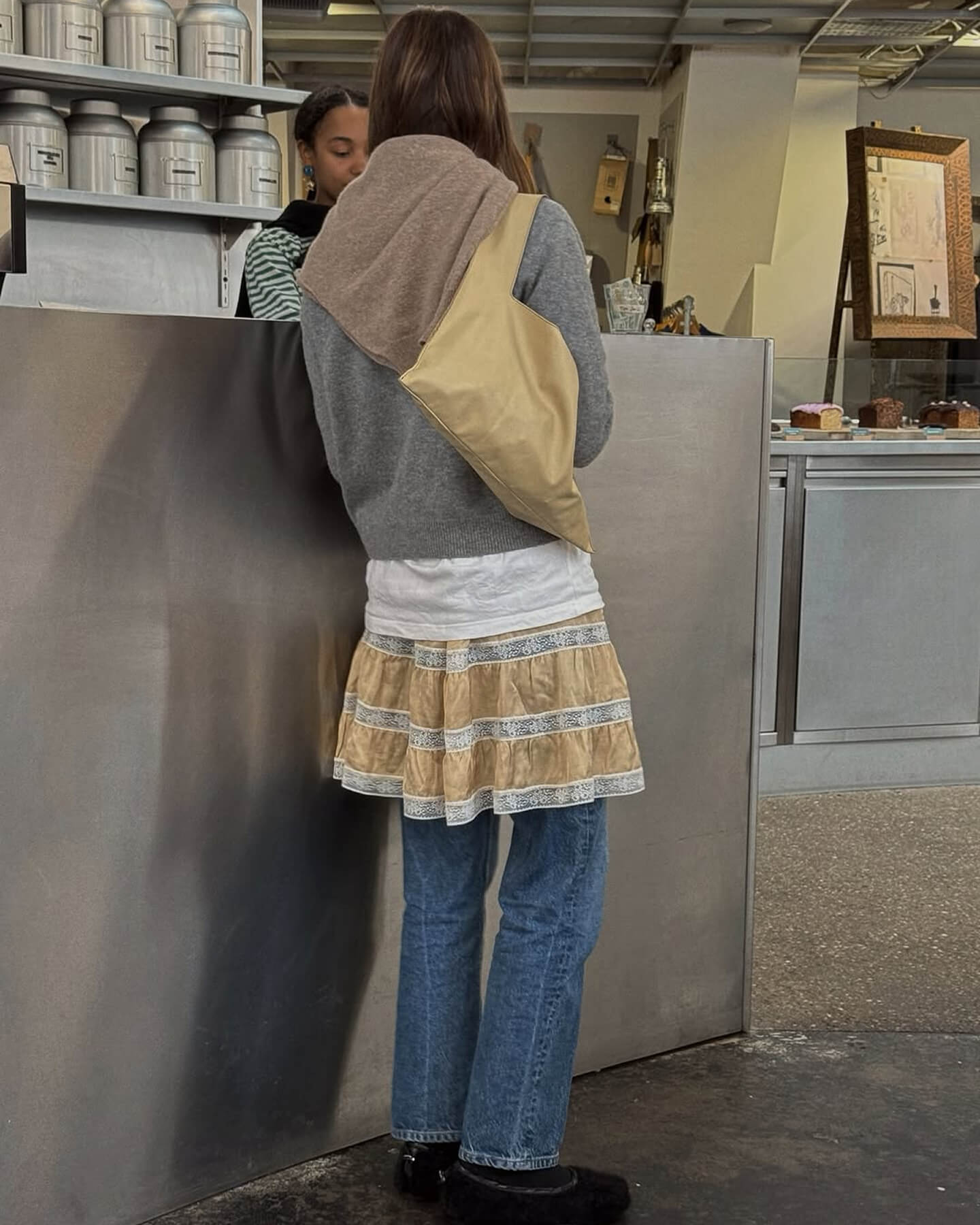 И летняя юбка с брюками, и свитер в роли шарфа — знакомые приемы, но совмещенные в одном образе они по-прежнему выглядят остро. А чтобы стайлинг стал чуть более ироничным, разбавьте «цитаты» из соцсетей «неподходящим» элементом, таким как меховые лоферы.
