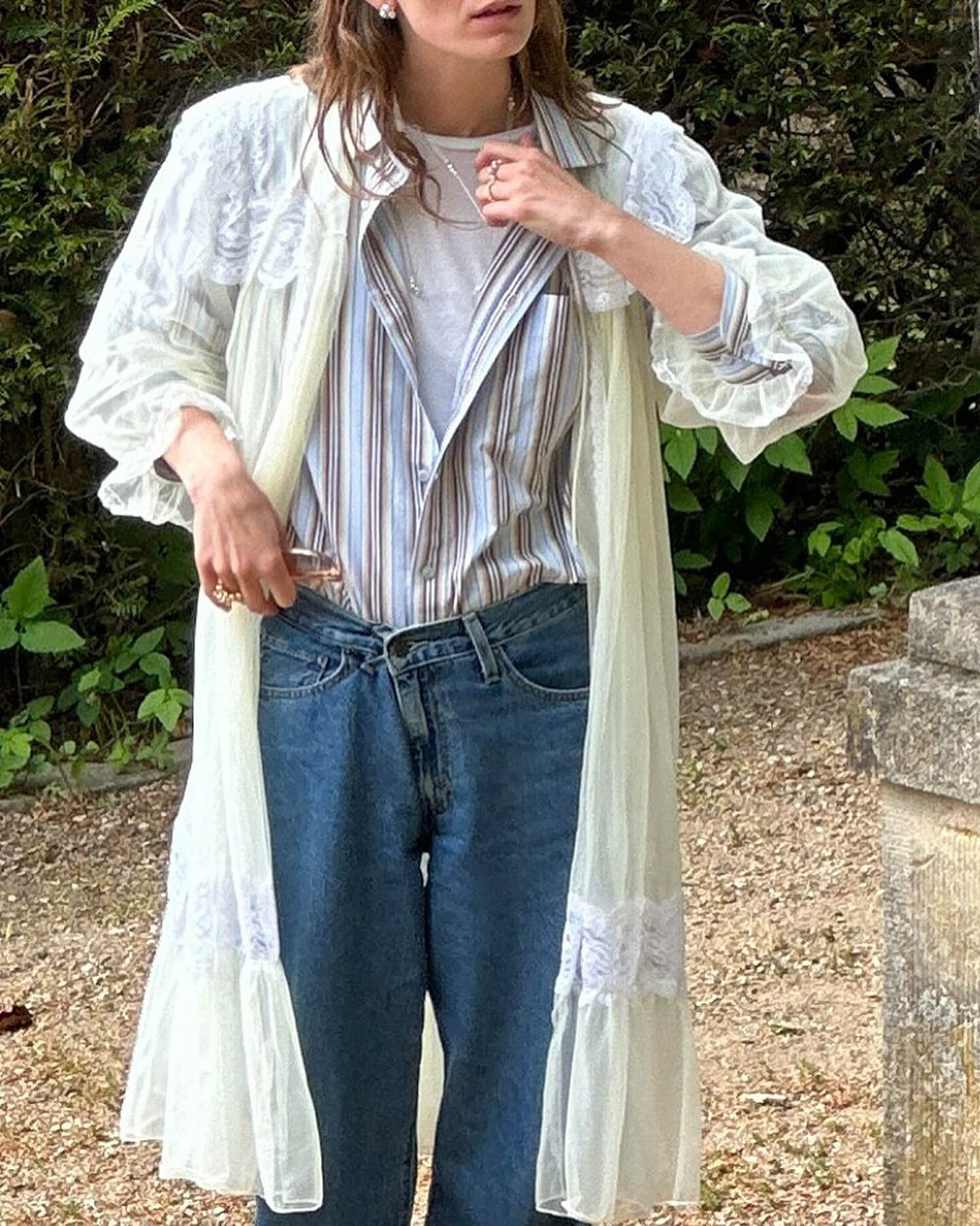Кружевные вещи часто служат дополнением образов: прозрачный топ, выглядывающий из-под кардигана, жакет поверх платья в бельевом стиле. Сломайте схему и наденьте кружево поверх чего-то более плотного — гарантированно получите свежий стайлинг. Инфлюенсер Катрин Марон, например, использует кружевную накидку прямо на «офисную» рубашку.